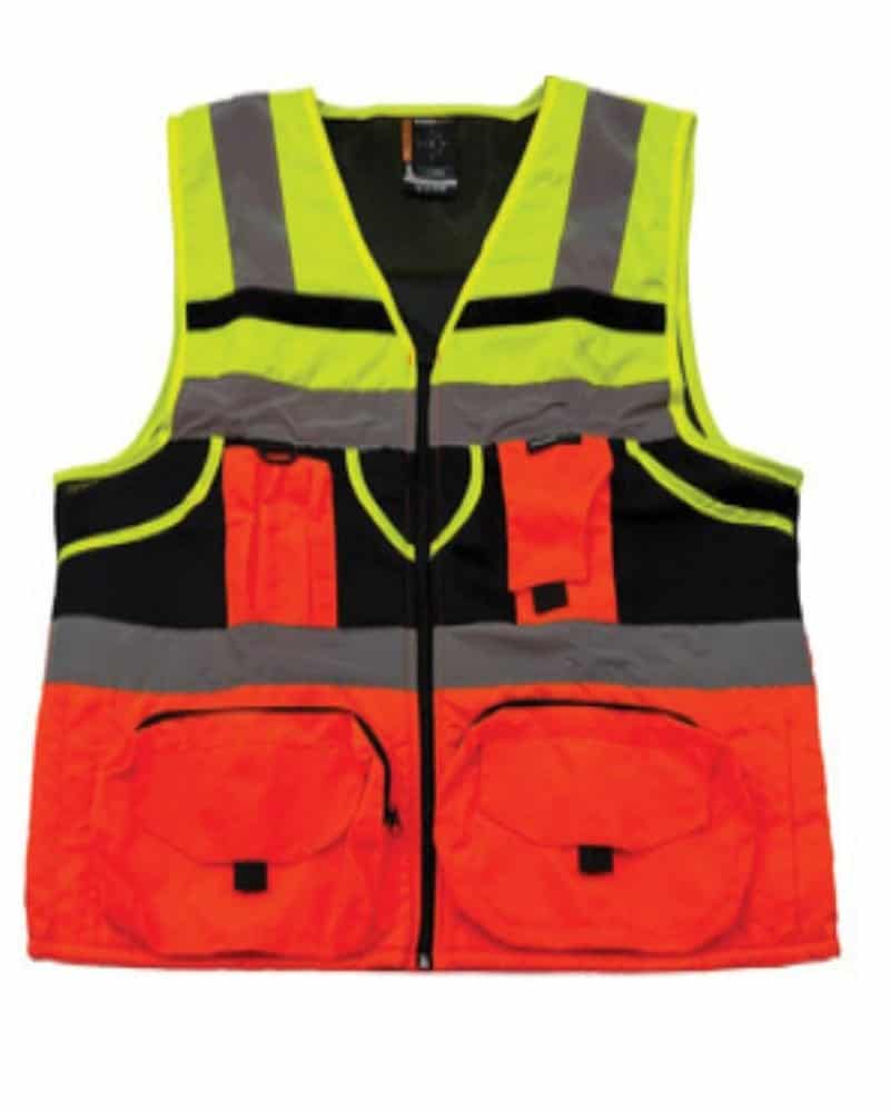 Safety is prioritized with 50 mm Class 2 reflective tape arranged in a striking two-tone high-visibility layout, ensuring you’re seen in low-light or fast-moving settings. Practicality shines through with multiple utility pockets—including top, lower, and side storage options—so your tools, electronics, and essentials stay close at hand.