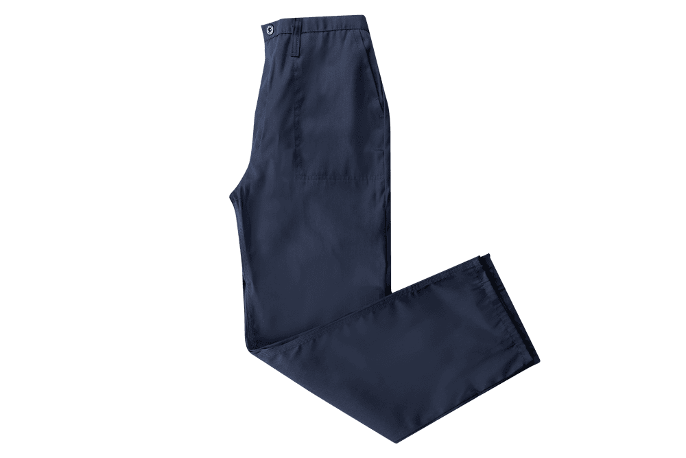 • Utility trousers: elasticated back, metal combo-button/zip fly, belt loops, slanted side pockets, back pocket, reinforced seams.